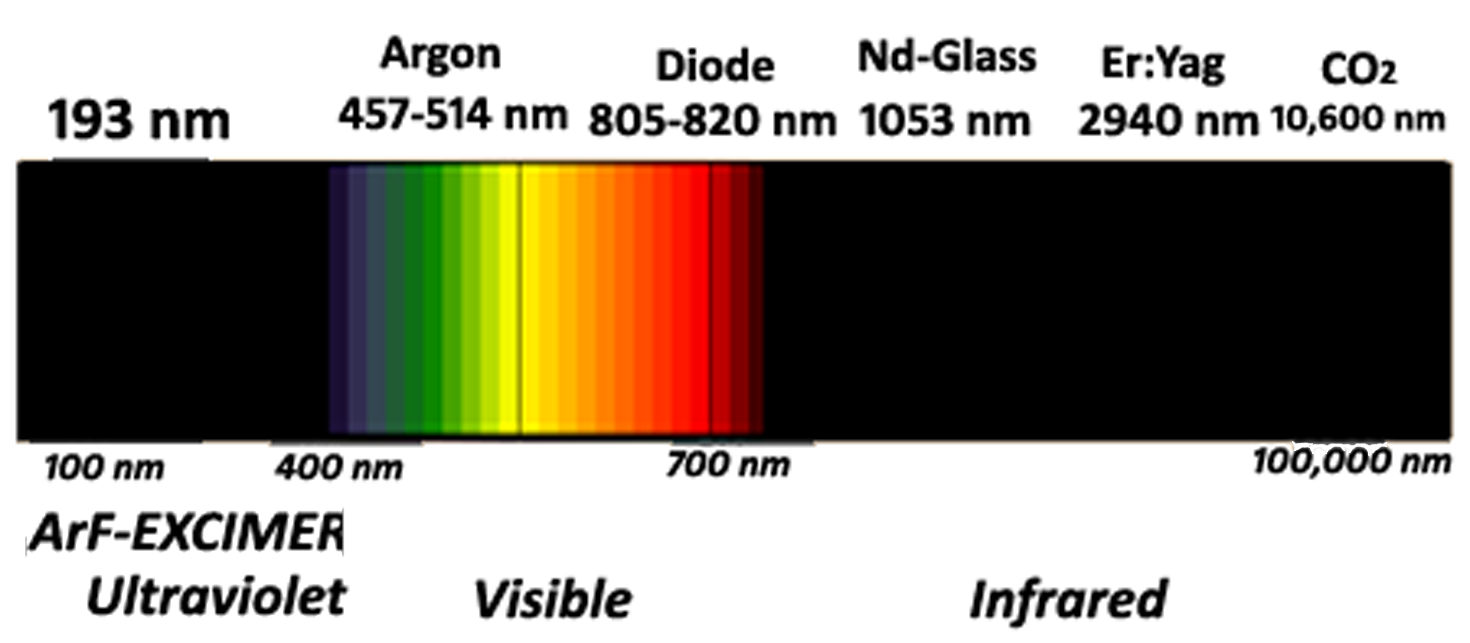 Wavelengths under 600nm are strongly absorbed by hemoglobin and protein, and wavelengths above 900nm are strongly absorbed by the water in tissue. Skin is relatively transparent in the range of 600nm to 900nm. Melanin bearing structures are the most attractive target for laser energy. Energy absorption by melanin decreases with increasing wavelength. Diode laser (810nm) features a perfect wavelength and pulse width, theoretically offering an advantage to treat all types of patients, darker skinned patients also and especially for Indian skin.
